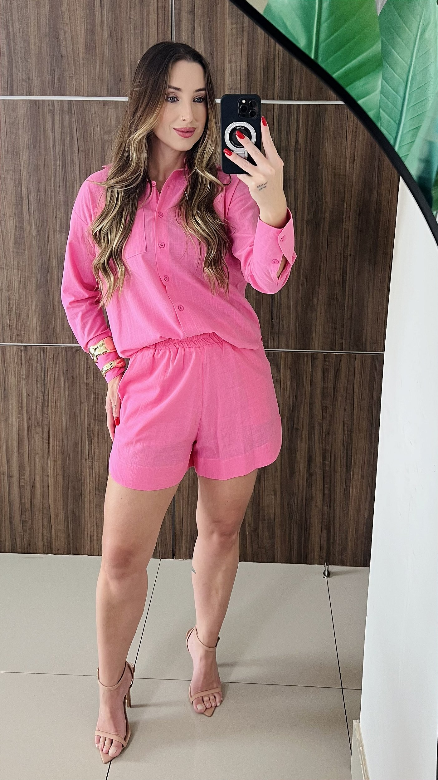 O short tem cintura com elástico, proporcionando ajuste confortável ao corpo e caimento solto, perfeito para os dias mais quentes. O conjunto pode ser usado junto para uma proposta moderna e chic ou separado, ampliando as possibilidades de looks.