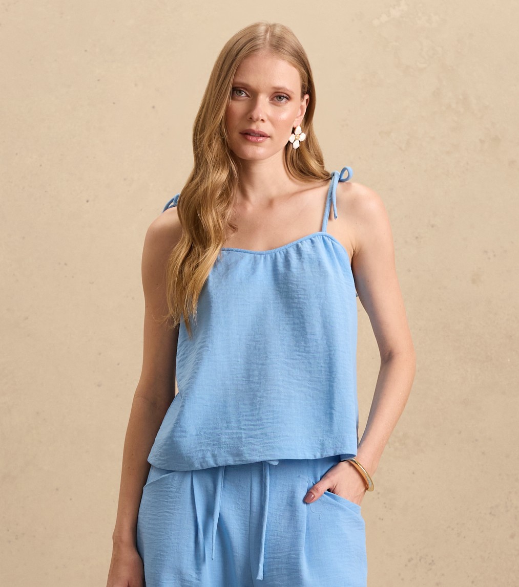 Regata - Tecido que mimetiza linho/ alças de cordão encampado do próprio tecido para amarração / comprimento na altura do quadril